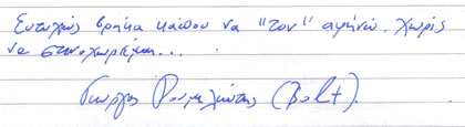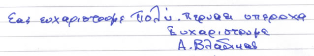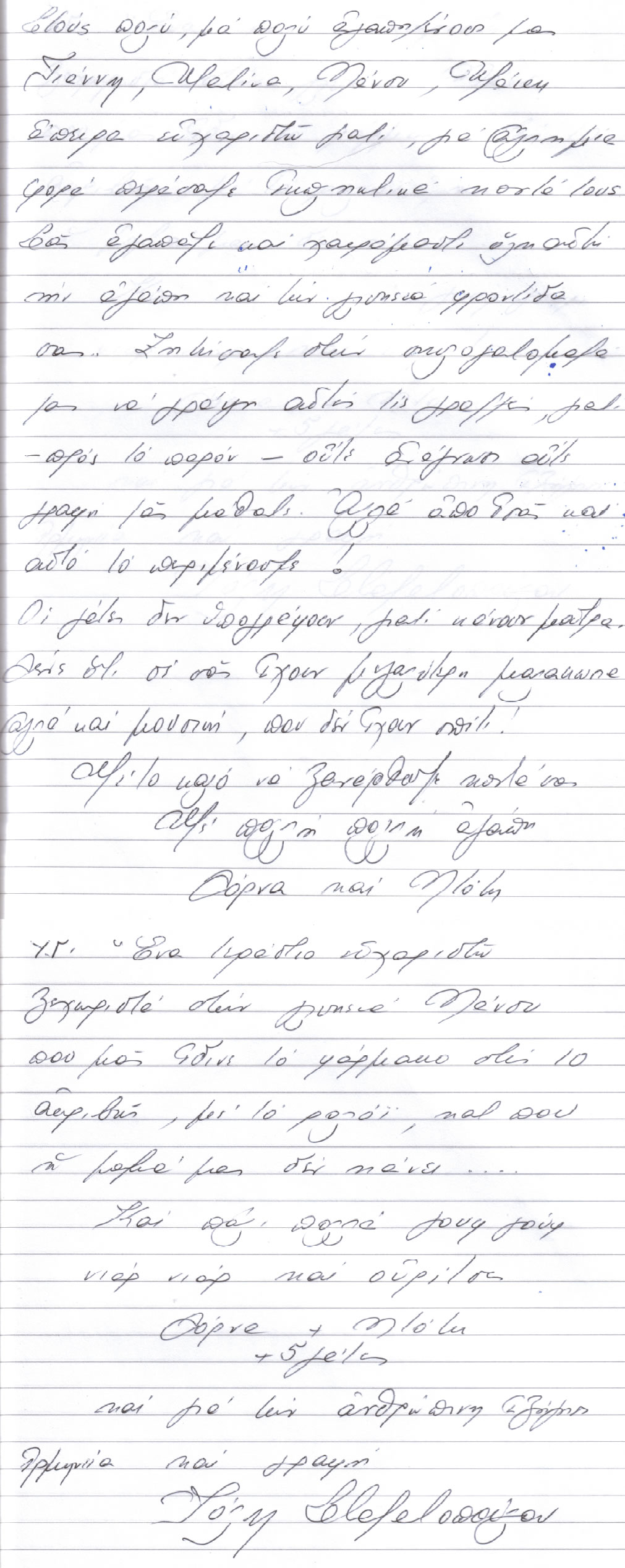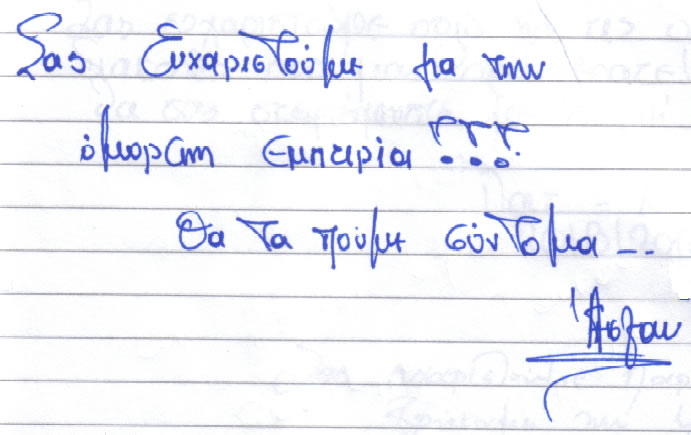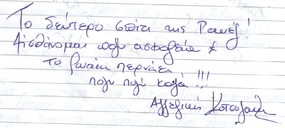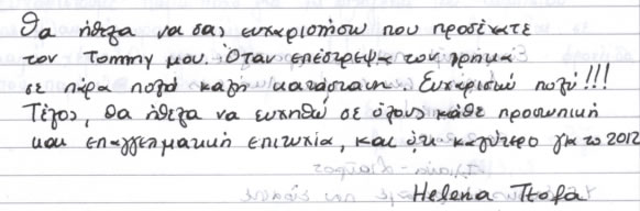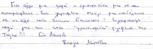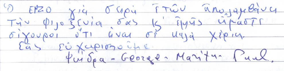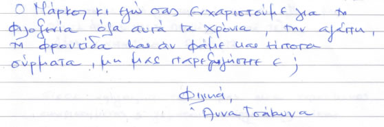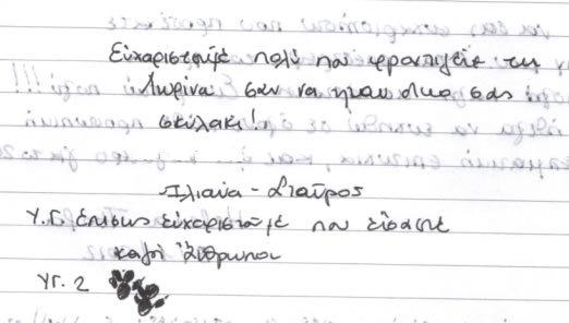 Στους πολύ, μα πολύ αγαπημένους μας Γιάννη, Ματίνα, Νάνσυ, Μάκη άπειρα ευχαριστώ πάλι, για άλλη μία φορά περάσαμε εκπληκτικά κοντά τους. Σας αγαπάμε και χαιρόμαστε όλη αυτή την αγάπη και τη γνήσια φροντίδα σας. Ζητήσαμε στη σκυλομαμά μας να γράψει αυτές τις γραμμές, γιατί – προς το παρόν – ούτε ανάγνωση ούτε γραφή μας μάθανε. Αλλά από εσάς και αυτό το περιμένουμε!