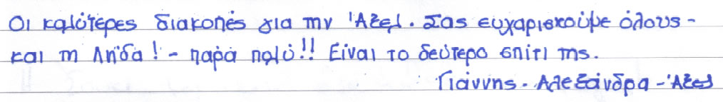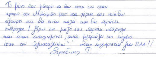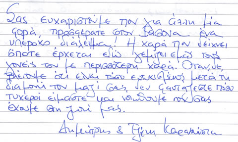 Σας ευχαριστούμε που για άλλη μια φορά προσφέρατε στον Ιάσονα ένα υπέροχο διάλειμμα! Η χαρά που δείχνει όποτε έρχεται εδώ γεμίζει εμάς τους γονείς του με περισσότερη χαρά. Όταν, δε, βλέπουμε ότι είναι τόσο ευτυχισμένος μετά τη διαμονή του μαζί σας, δε φαντάζεστε πόσο τυχεροί είμαστε και νοιώθουμε που σας έχουμε στη ζωή μας.