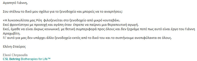 Η λυκοσκυλίτσα μας Ρόη φιλοξενείται στο ξενοδοχείο από μικρό κουταβάκι. Εκεί φροντίστηκε με προσοχή και αγάπη όταν έπρεπε να παίρνει μια θεραπευτική αγωγή. Εκεί, έμαθε να είναι άκρως κοινωνική με θετική συμπεριφορά προς όλους και δεν ξεχνάμε ποτέ πως αυτό είναι έργο του Γιάννη Αραχωβίτη. Γι’ αυτό για μας δεν υπάρχει άλλο ξενοδοχείο εκτός από το δικό του και το συστήνουμε ανεπιφύλακτα σε όλους.