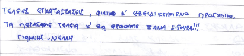 Παρακάτω μπορείτε να διαβάσετε όλα τα σχόλια που έχουν γραφτεί για εμάς και την πανσιόν μας. Πατώντας το εικονίδιο, δίπλα σε κάθε σχόλιο, μπορείτε να δείτε και το αυθεντικό χειρόγραφο από το βιβλίο πελατών που διατηρούμε στο ξενοδοχείο μας. Ευχόμαστε κάποια στιγμή να προσθέσουμε και το δικό σας…