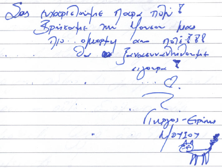 Οι γάτες δεν υπογράφουν, γιατί κάνουν μούτρα. Λένε ότι σε εσάς έχουν μεγαλύτερη μαλακωσιά αλλά και μουσική, που δεν έχουν σπίτι! Με το καλό να ξανάρθουμε κοντά σας. Με πολλή πολλή αγάπη, Λόρνα και Ντότη Υ.Γ. Ένα μεγάλο ευχαριστώ ξεχωριστά στη γλυκιά Νάνσυ που μας έδινε το φάρμακο στις 10 ακριβώς, με το ρολόι, κάτι που η μαμά μας δεν κάνει… Και πάλι πολλά γουφ γουφ νιαρ νιαρ και ουρίτσες Λόρνα + Ντότη + 5 γάτες Και για την ανθρώπινη εξήγηση, ερμηνεία και γραφή… Ιόλη Σταματοπούλου