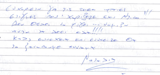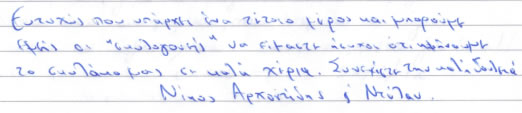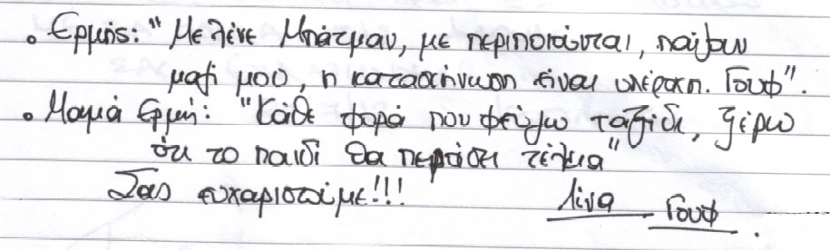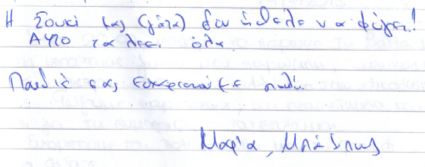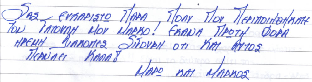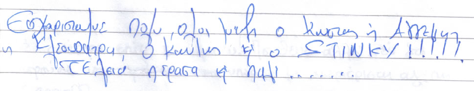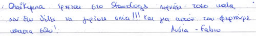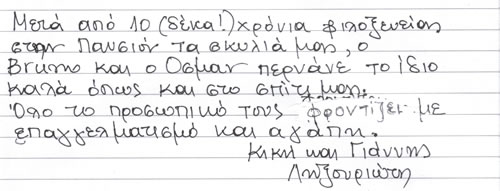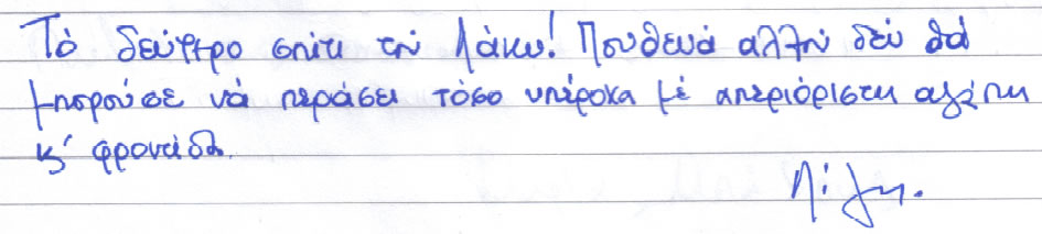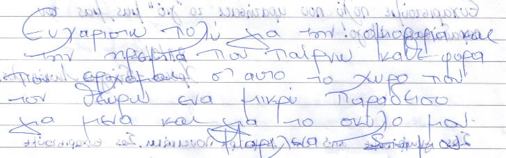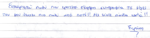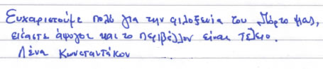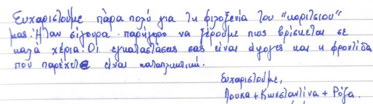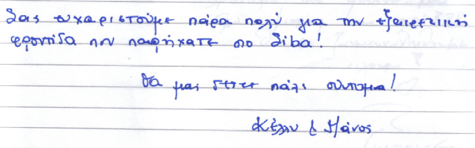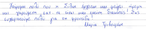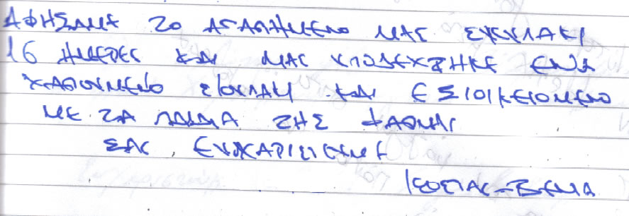 Παρακάτω μπορείτε να διαβάσετε όλα τα σχόλια που έχουν γραφτεί για εμάς και την πανσιόν μας. Πατώντας το εικονίδιο, δίπλα σε κάθε σχόλιο, μπορείτε να δείτε και το αυθεντικό χειρόγραφο από το βιβλίο πελατών που διατηρούμε στο ξενοδοχείο μας. Ευχόμαστε κάποια στιγμή να προσθέσουμε και το δικό σας…