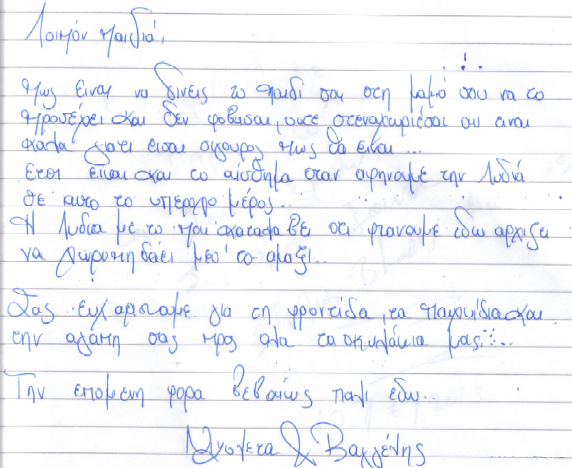 Πώς είναι να δίνεις το παιδί σου στη μαμά σου να το προσέχει και δε φοβάσαι, ούτε στεναχωριέσαι αν είναι καλά γιατί είσαι σίγουρος πώς θα είναι… Έτσι είναι το αίσθημα όταν αφήνουμε τη Λυδία σε αυτό το υπέροχο μέρος… Η Λυδία με το που καταλάβει ότι φτάνουμε εδώ αρχίζει να χοροπηδάει μέσα στο αμάξι… Σας ευχαριστούμε για τη φροντίδα, τα παιχνίδια και την αγάπη σας προς όλα τα σκυλάκια μας… Την επόμενη φορά βεβαίως πάλι εδώ… Νικολέτα & Βαγγέλης